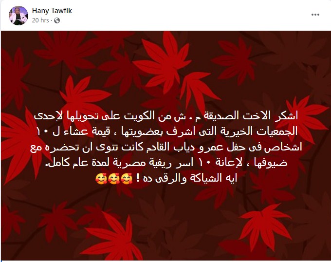 أثار تبرع سيدة كويتية، بقيمة 10 تذاكر من حفل الفنان عمرو دياب لعشر أسر ريفية في مصر، جدلًا واسعًا بين نشطاء مواقع التواصل الاجتماعي، فبعد إعلان الخبير الاقتصادي هاني توفيق أن سيدة كويتية فضلت أن تتبرع بمبلغ 100 ألف جنيه، قيمة 10 تذاكر في حفل عمرو دياب المقبلة، كانت تنتوي حضورها مع أصدقائها، لإعانة 10 أسر لمدة عام كامل، الأمر الذي أثار استحسان وثناء نشطاء مواقع التواصل الاجتماعي.