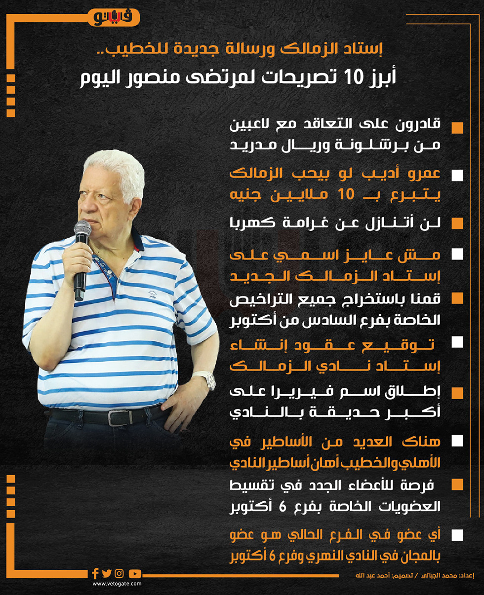 إستاد الزمالك ورسالة جديدة للخطيب.. أبرز 10 تصريحات لمرتضى منصور اليوم | إنفوجراف الأربعاء 03/أغسطس/2022 - 07:20 م 8/3/2022 7:20:05 PM مرتضى منصور شارك طباعة 18 حجم الخط شارك طباعة استاد الزمالك الجديد الزمالك برشلونة وريال مدريد مرتضى منصور نادي الزمالك غرامة كهربا
