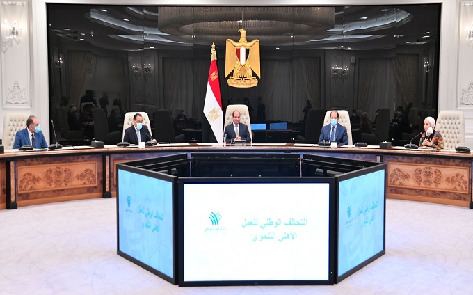 وصرح السفير بسام راضي المتحدث الرسمي باسم رئاسة الجمهورية بأن الاجتماع تناول "استعراض نشاط التحالف الوطني، منذ انطلاقة فقط مطلع العام الحالى والذي يتكون من ٢٤ جمعية ومؤسسة أهلية بالإضافة إلى مؤسسة حياة كريمة، والاتحاد العام للجمعيات والمؤسسات الأهلية.