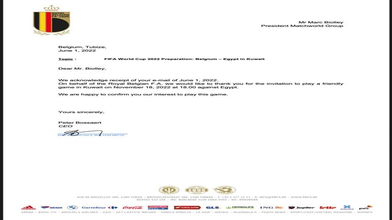 وطلب الاتحاد البلجيكي مواجهة منتخب مصر وديا يوم 18 نوفمبر القادم الساعة 6 مساء بدولة الكويت وذلك في إطار استعدادات المنتخب البلجيكي لكأس العالم 2022 المقام في قطر.