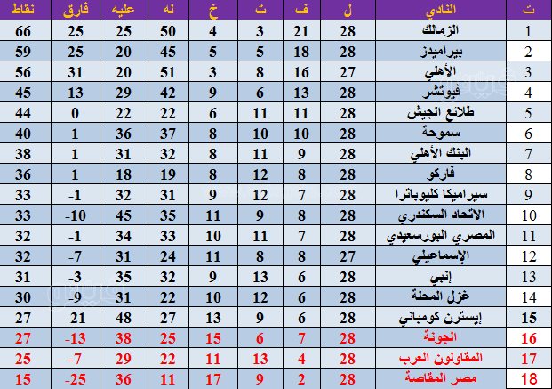 تنشر فيتو جدول ترتيب الدوري الممتاز بعد انتهاء مباريات الجولة الـ 28 لمسابقة الدوري العام بلقاء الأهلي وفاركو.
