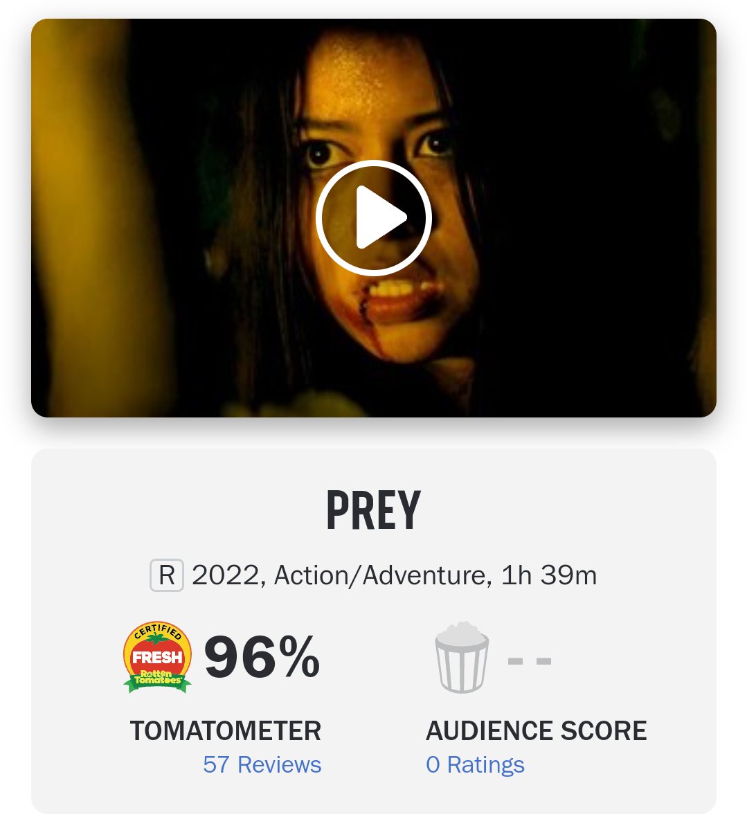 حصل فيلم Prey على تقييمات إيجابية قبل طرحه رسميا غدا الجمعة على منصة 'Hulu الرقمية، حيث حصد الفيلم تقييم وصلت نسبته إلى 96% على موقع التقيمات الشهير Rotten Tomatoes.