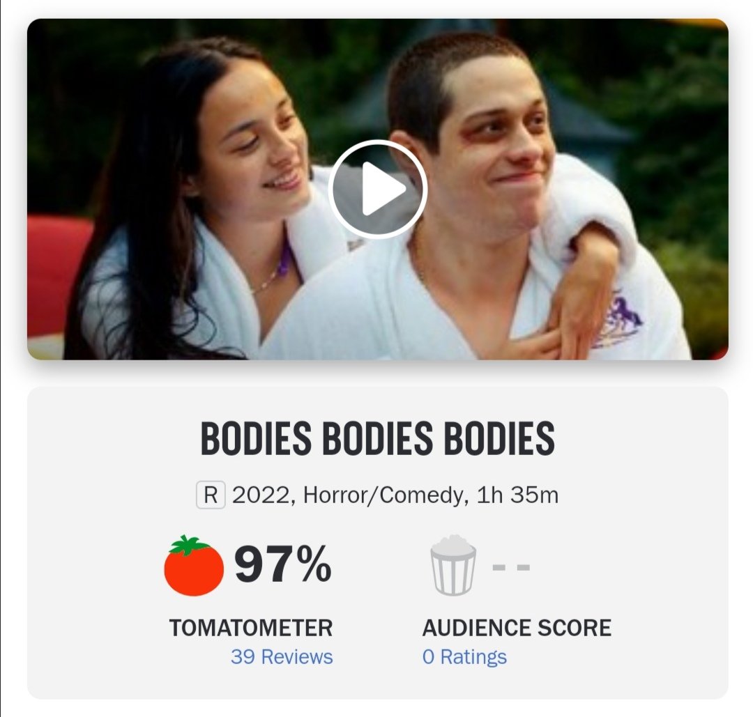 حصل فيلم Bodies Bodies Bodies والذي يلعب بطولته حبيب كيم كارداشيان الجديد بيت ديفيدسون في أول تجربة سينمائية له، على تقييمات أولية ممتازة، حيث بلغت 97% على موقع التقيمات الشهير 'Rotten Tomatoes'.