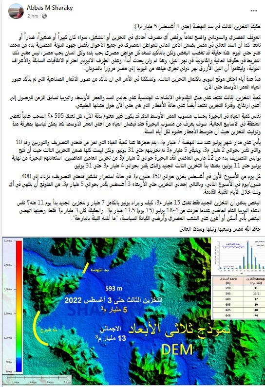 وكتب الدكتور عباس شراقي تدوينة على الفيس بوك: "حقيقة التخزين الثالث فى سد النهضة (حتى 3 أغسطس 5 مليار م3): الموقف المصرى والسودانى واضح تمامًا برفض أى تصرف أحادى فى التخزين أو التشغيل، سواء كان كبيرًا أو صغيرًا، ضارًا أو نافعًا".