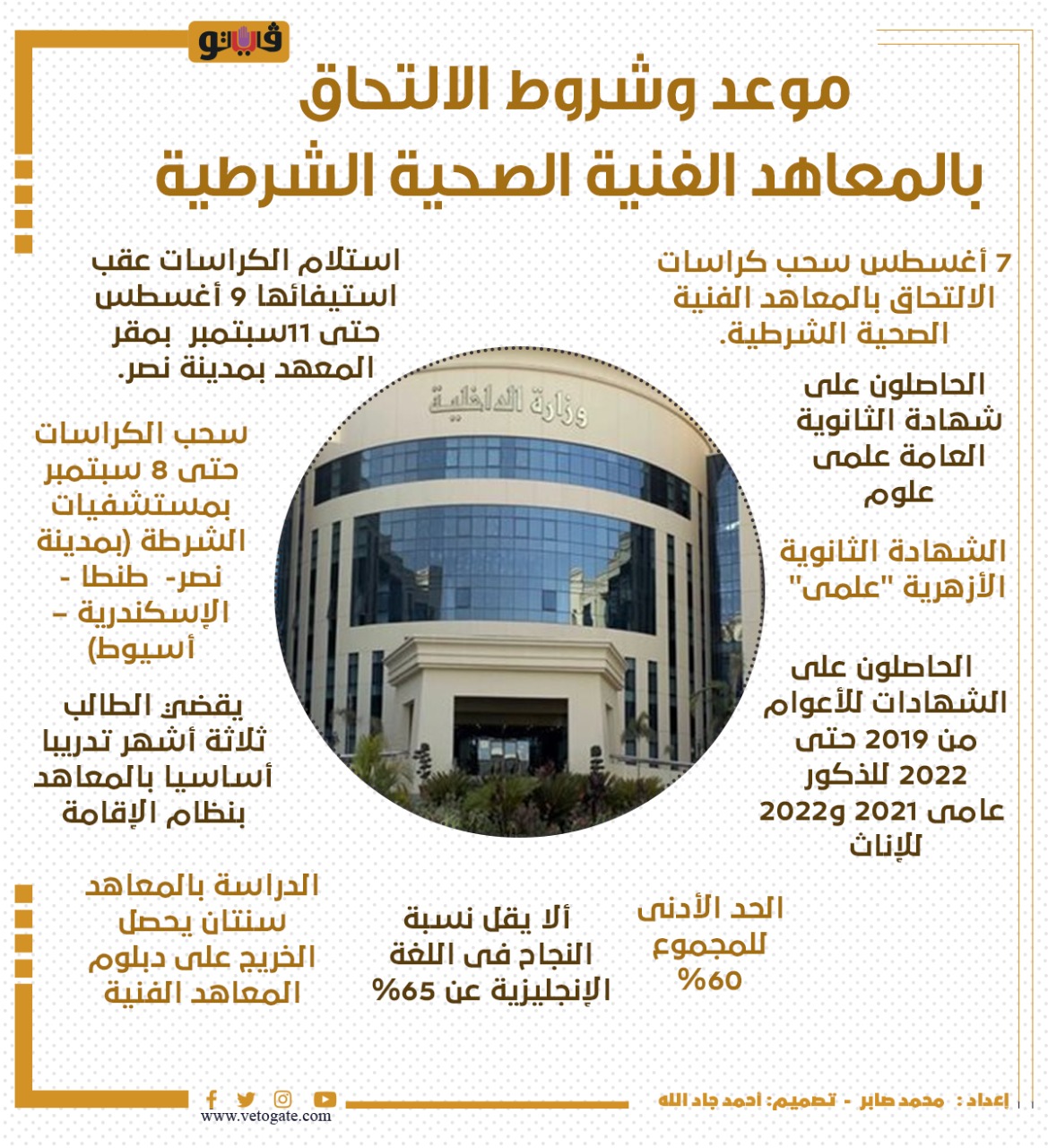 موعد وشروط الالتحاق بالمعاهد الفنية الصحية الشرطية| إنفوجراف الخميس 04/أغسطس/2022 - 08:59 م 8/4/2022 8:59:42 PM موعد وشروط الالتحاق بالمعاهد الفنية الصحية الشرطية محمد صابر شارك طباعة 18 حجم الخط شارك طباعة الشهادة الثانوية الازهرية المعاهد الفنية الصحية الشرطية المعاهد الفنية الصحية شهادة الثانوية العامة وزارة الداخلية مستشفى الشرطة بمدينة نصر