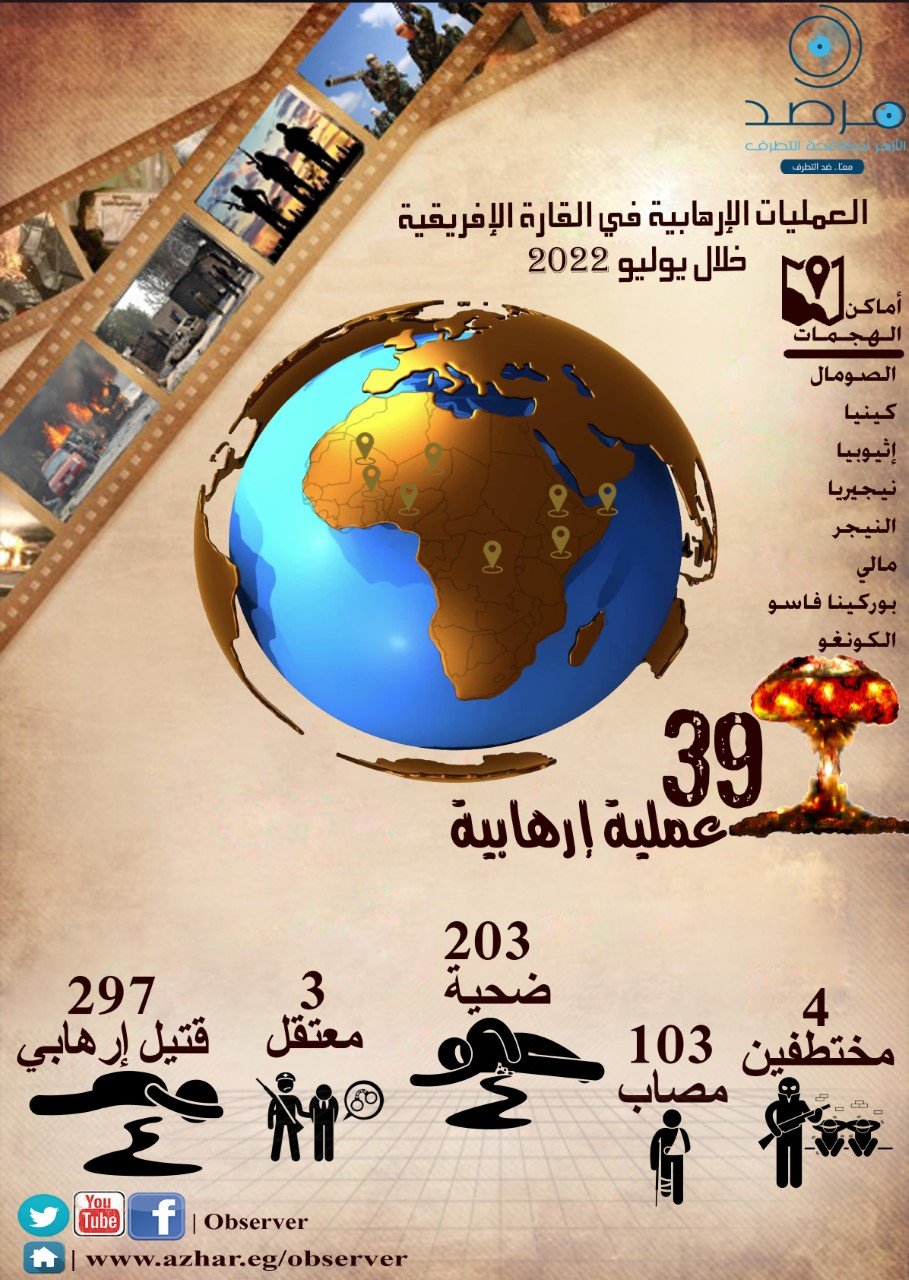 أوضح مرصد الأزهر لمكافحة التطرف أنه في إطار مواصلة وحدة اللغات الإفريقية لرصد جميع الأخبار التي تتعلق بالشأن الإفريقي ومتابعتها لأهم القضايا المُثارة في وسائل الإعلام في إفريقيا، تابعت الوحدة على مدار شهر يوليو 2022م باهتمامٍ وحرص بالغين أنشطة التنظيمات الإرهابية.