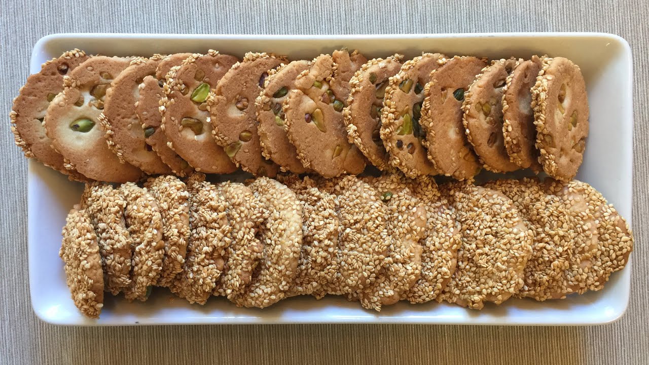 نغمس قطع العجين بالفستق على الوجه الأول، ونغمس الوجه الثاني بالسمسم مع الضغط عليها وتدويرها؛ حتى تصبح دائرية الشكل، ثم ننقل قطع البرازق الى صينية فرن بحيث يكون وجه السمسم نحو الأعلى.