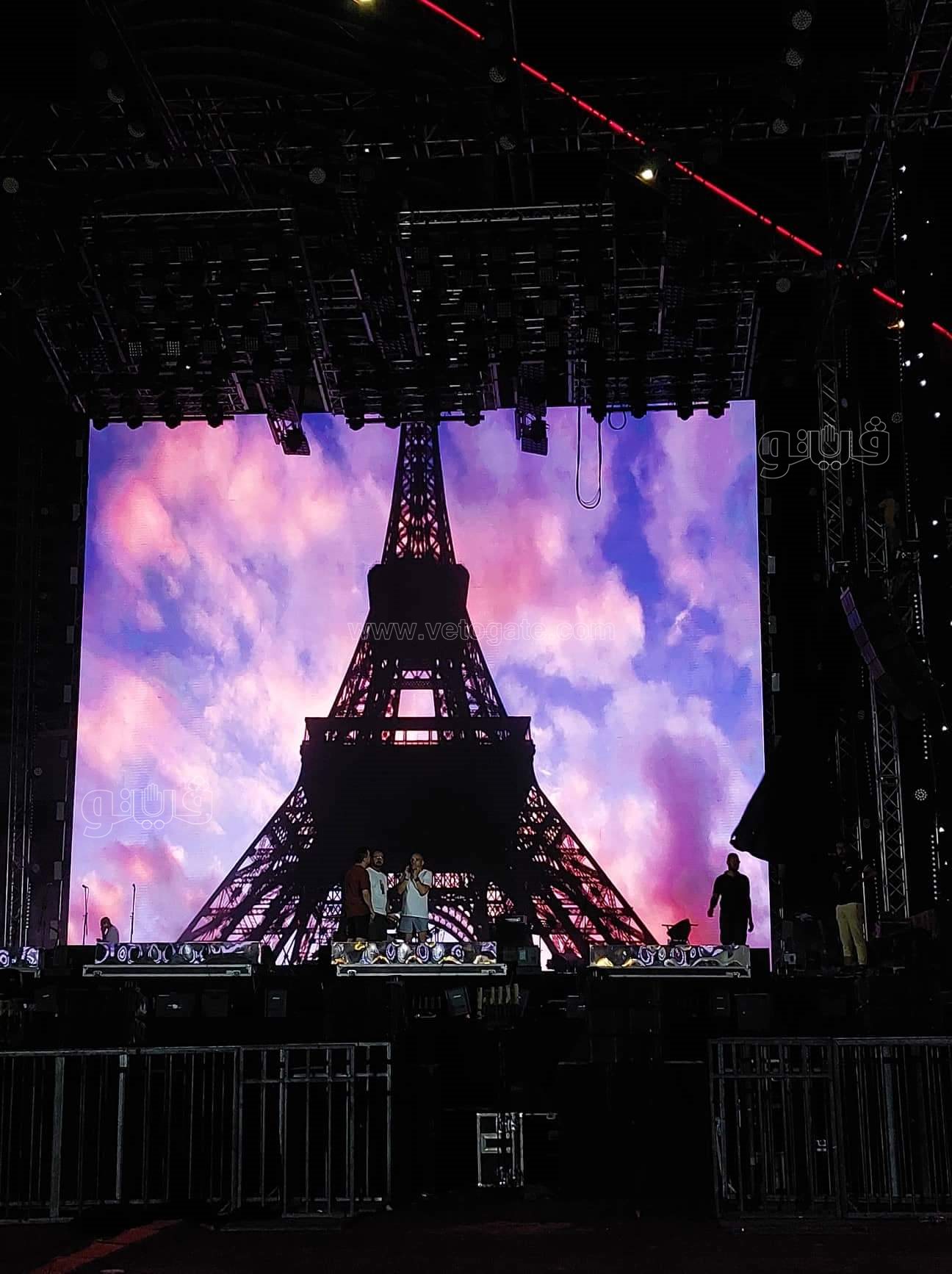 برج إيفل يزين المسرح.. تجهيزات حفل عمرو دياب بالساحل الشمالي|صور