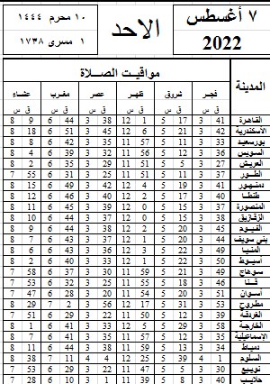 مواقيت الصلاة اليوم وفقًا للتوقيت المحلي لمدينتي القاهرة والإسكندرية وعدد من مدن ومحافظات الجمهورية من واقع بيانات الهيئة العامة للمساحة: