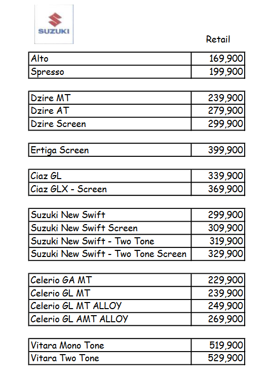 ويذكر أن تتوافر سيارات سوزوكي داخل السوق المصري بفئات عديدة وهي:"ألتو-إسبريسو-وديزاير- وسويفت- وسيلاريو- وسياز- وأرتيجا- وفيتارا".