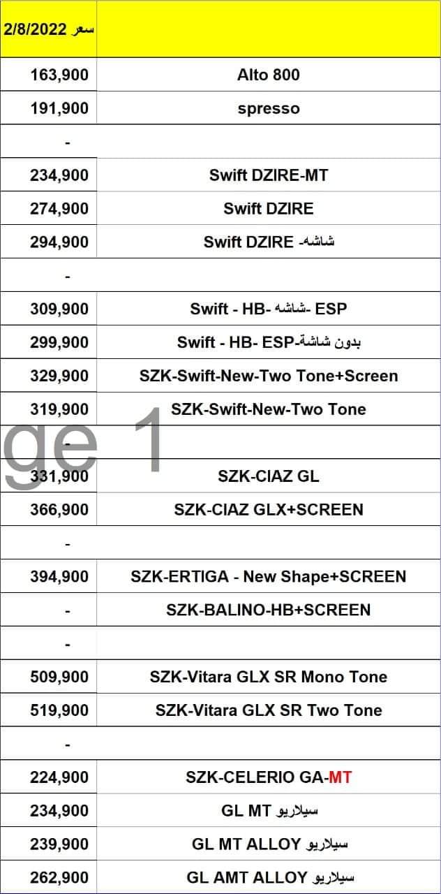 وأخطر الوكيل المحلي لسيارات سوزوكي، الموزعين والتجار بزيادة أسعار السيارات لثاني مرة علي التوالي خلال الشهر الحالي، ويتم العمل بالأسعار الجديدة بدايةً من اليوم 7-8-2022 وتتراوح حجم الزيادة ما بين 5 حتى 10 آلاف جنيه وهي كالتالي:-