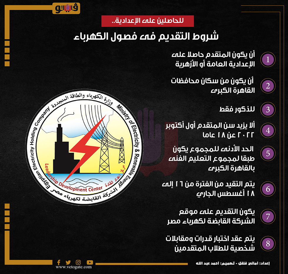 للحاصلين على الإعدادية.. شروط التقديم فى فصول الكهرباء | إنفوجراف الإثنين 08/أغسطس/2022 - 12:57 م 8/8/2022 12:57:23 PM تنسيق المدارس الفنية أماني فلفل شارك طباعة 18 حجم الخط شارك طباعة فصول الكهرباء القاهرة الكبري الاعدادية العامة