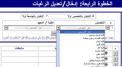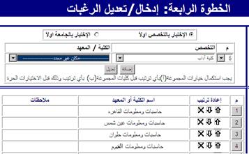 ويمكن للطالب من خلال استعمال الأسهم يمكن إعادة ترتيب الرغبات ويتم تصحيح الأخطاء غير المتطابقة للتوزيع الجغرافي.