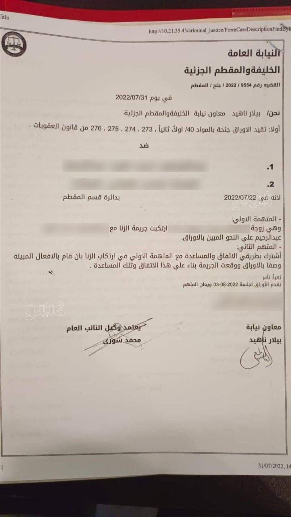 وجاء في نص الإحالة أولا: تقيد الأوراق جنحة بالمواد 140 أولا، ثانيا، 273، 274، 275، 276 من قانون العقوبات، ضد كلا من ع. أ، ون. ح لأنه في 2022/07/22، ارتكبت المتهمة جريمة الزنا مع المتهم الثاني على النحو المبين بالأوراق.