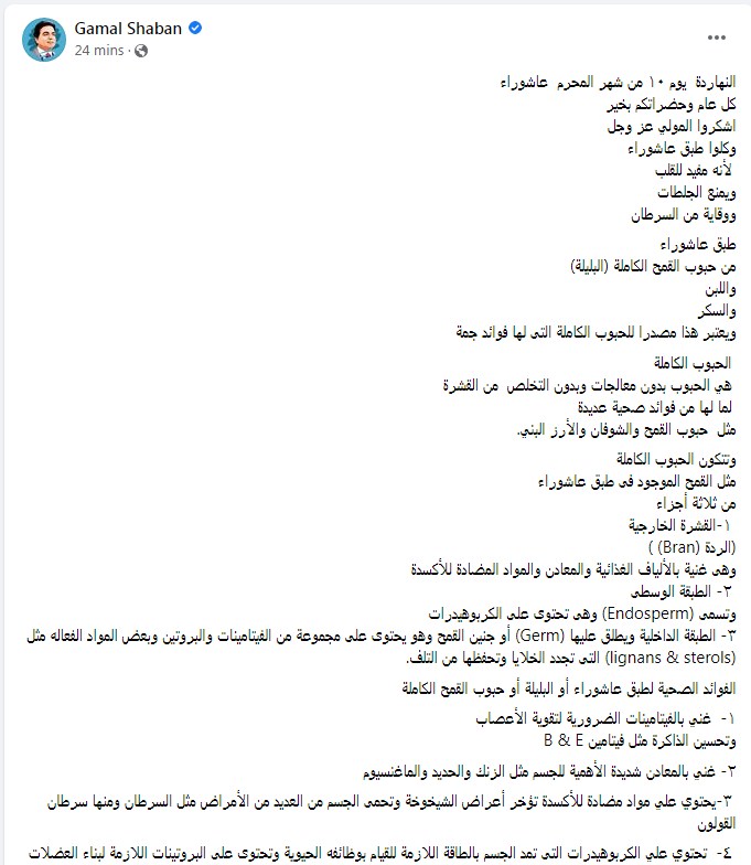 وكتب جمال شعبان تدوينة على الفيس بوك " النهاردة يوم ١٠ من شهر المحرم عاشوراء كل عام وحضراتكم بخير اشكروا المولى عز وجل وكلوا طبق عاشوراء لأنه مفيد للقلب ويمنع الجلطات ووقاية من السرطان".