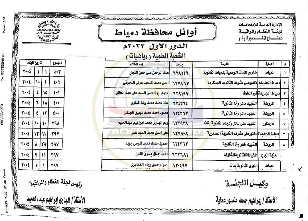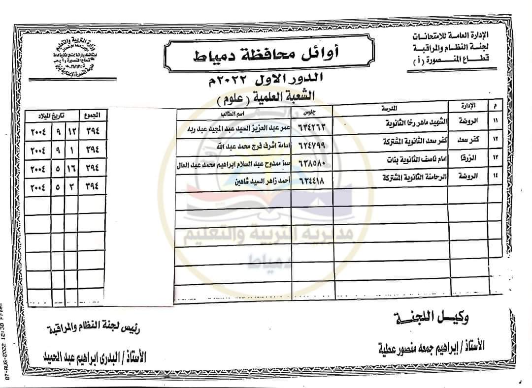 أعلنت مديرية التربية والتعليم بمحافظة دمياط اليوم أسماء أوائل شهادة الثانوية العامة للعام الدراسي ٢٠٢٢ بقسميها العلمي شعبتي العلوم والرياضيات والشعبة الأدبية.