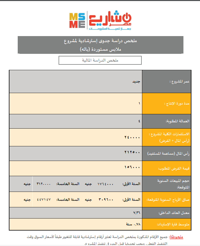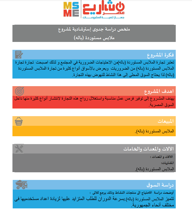 وتستعرض "فيتو" كافة التفاصيل المتعلقة بدراسة جدوى استرشادية مشروع ملابس مستوردة “بالة”، والتي أعدها جهاز تنمية المشروعات الصغيرة والمتوسطة خلال السطور التالية: