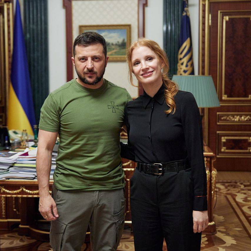 ونشر الرئيس الأوكراني زيلينسكي صورًا للاجتماع مع الممثلة العالمية جيسيكا شاستين على حسابه على Telegram قائلا: "الممثلة الأمريكية جيسيكا شاستين موجودة في أوكرانيا اليوم.. بالنسبة لنا.. تعتبر زيارات المشاهير هذه قيمة للغاية.. بفضل هذا، سوف يسمع العالم ويعرف ويفهم حقيقة ما يحدث في بلدنا أكثر. شكرا على الدعم!".