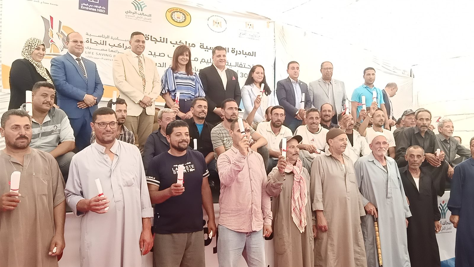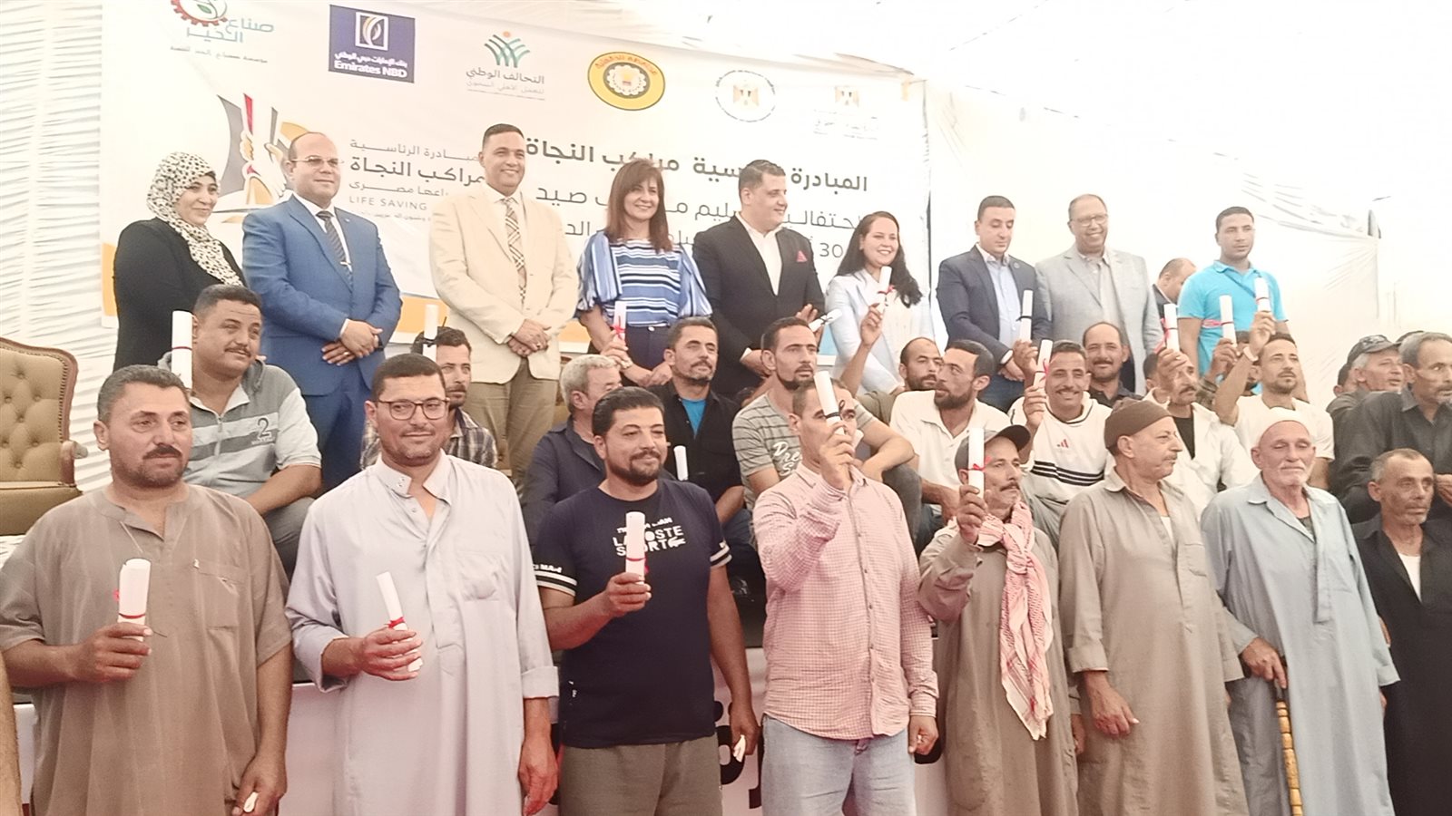 حرصت وزيرة الهجرة السفيرة نبيلة مكرم عبد الشهيد وزيرة الدولة للهجرة والمصريين بالخارج، والدكتور أيمن مختار محافظ الدقهلية على التقاط الصور التذكارية مع صيادي كريم بساط الدين.