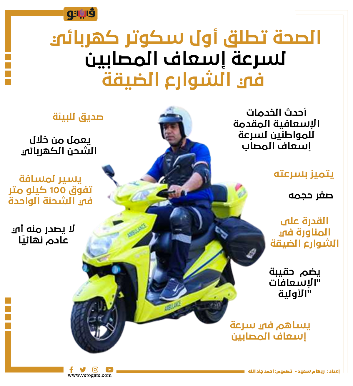 الصحة تطلق أول سكوتر كهربائي لسرعة إسعاف المصابين في الشوارع الضيقة|إنفوجراف الثلاثاء 09/أغسطس/2022 - 01:57 م 8/9/2022 1:57:02 PM الاسكوتر الكهربائي ريهام سعيد شارك طباعة 18 حجم الخط شارك طباعة الاسعافات الاولية الشحن الكهربائي وزارة الصحة خدمات الاسعاف شحن الكهرباء