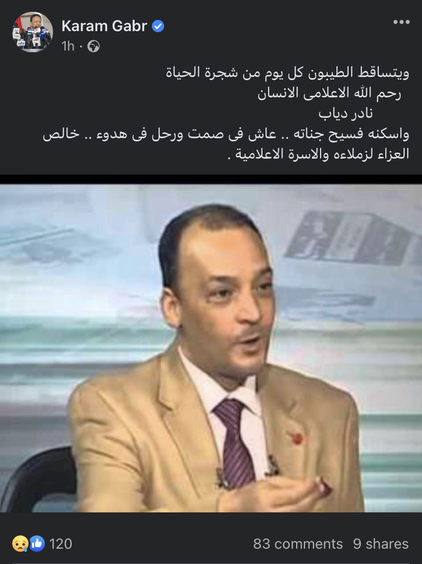 نعى الكاتب الصحفي كرم جبر، رئيس المجلس الأعلى لتنظيم الإعلام، عبر حسابه الشخصي على موقع التواصل الاجتماعي "فيس بوك" الإعلامي القدير نادر دياب، والذي وافته المنية اليوم الثلاثاء 9 أغسطس الجاري.