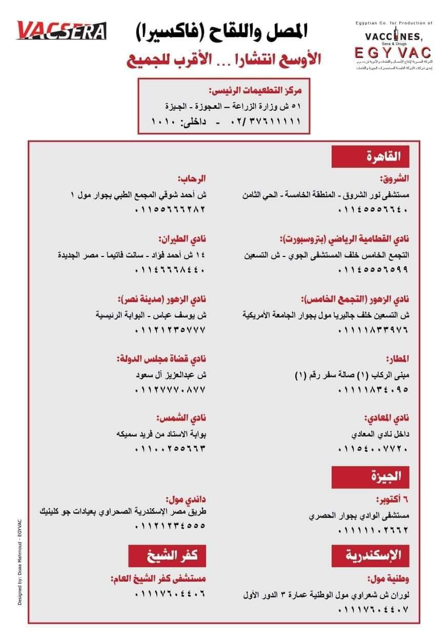 كشفت الشركة القابضة للمستحضرات الحيوية واللقاحات فاكسيرا عن عناوين فروعها المتوفر بها التطعيمات ومن المقرر توفير تطعيم الانفلونزا الموسمية.