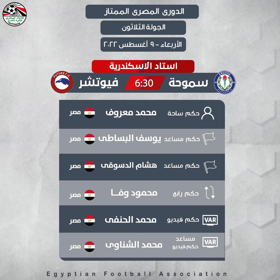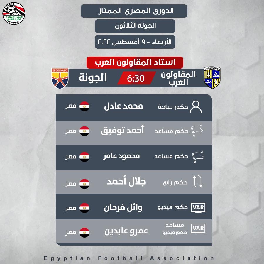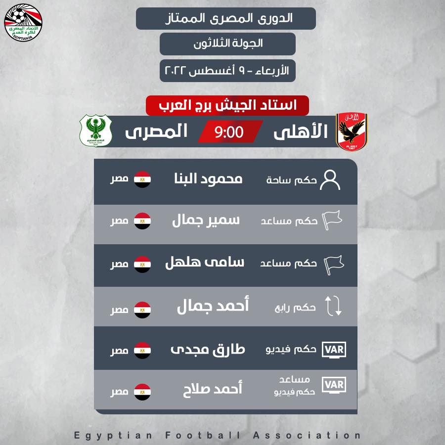 ويدير اللقاء محمود البنا حكم ساحة، سمير جمال حكم مساعد، سامي هلهل حكم مساعد، حكم رابع أحمد جمال، حكم فيديو طارق مجدي، مساعد حكم فيديوأحمد صلاح.