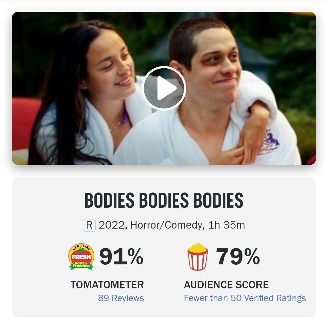 ما زال فيلم بيبت ديفيسون Bodies Bodies Bodies يحصد تقييمات جيدة بعد طرحه على المنصات الرقمية، حيث حصل الفيلم على تقييم مرتفع على موقع Rotten tomatoes بلغ %91 بناءً على 89 مراجعة نقدية.
