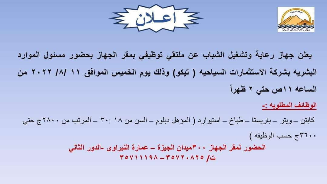 أعلن جهاز تشغيل الشباب بمحافظة الجيزة بقيادة عزة وهدان رئيس الجهاز عن ملتقي توظيفي بمقر الجهاز في حضور مسؤلي الموارد البشرية لشركة الاستثمارات السياحية تيكو وذلك غدا الخميس من الساعة ١١صباحا حتي الساعة الثانية ظهرا.