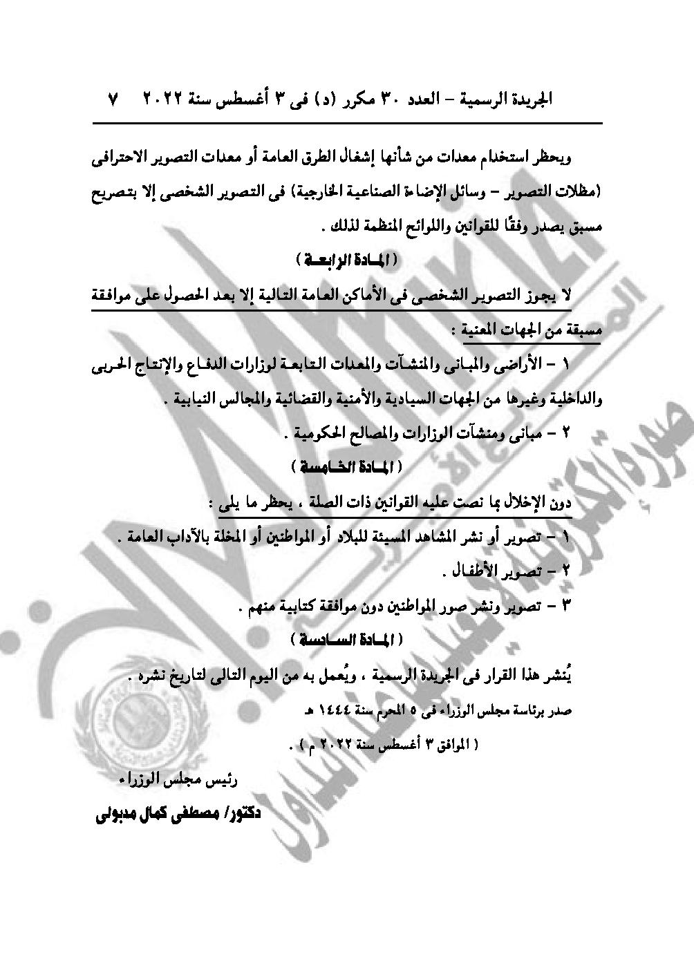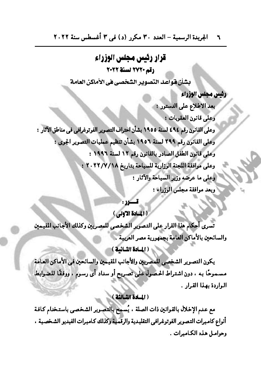 نشرت الجريدة الرسمية في عددها رقم 30 مكرر (د)، الصادر في 3 أغسطس 2022، قرار رئيس مجلس الوزراء الدكتور مصطفى مدبولي، بشأن قواعد التصوير الشخصي في الأماكن العامة.