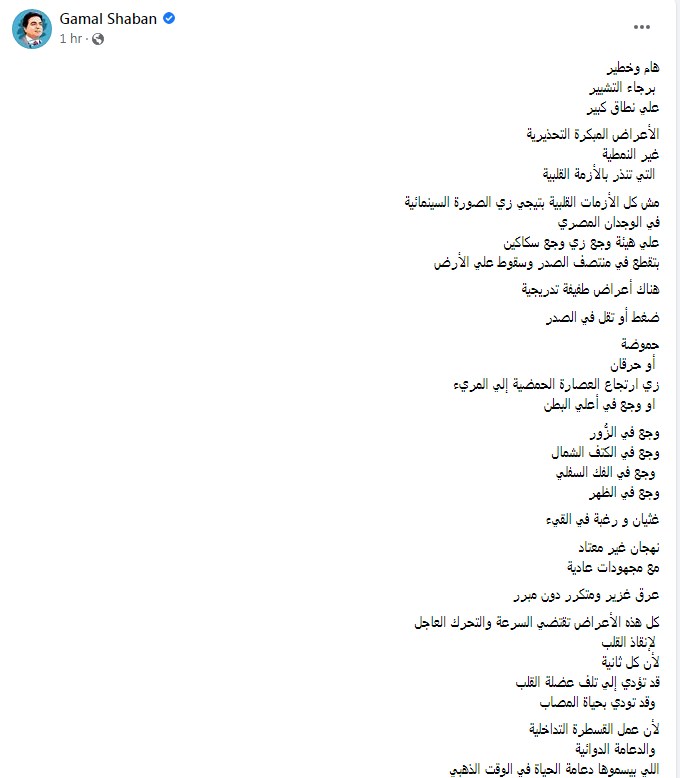 وكتب الدكتور جمال شعبان تدوينة على الفيس بوك: "هام وخطير.. الأعراض المبكرة التحذيرية غير النمطية التي تنذر بالأزمة القلبية، مش كل الأزمات القلبية بتيجي زي الصورة السينمائية في الوجدان المصري علي هيئة وجع زي وجع سكاكين بتقطع في منتصف الصدر وسقوط علي الأرض".