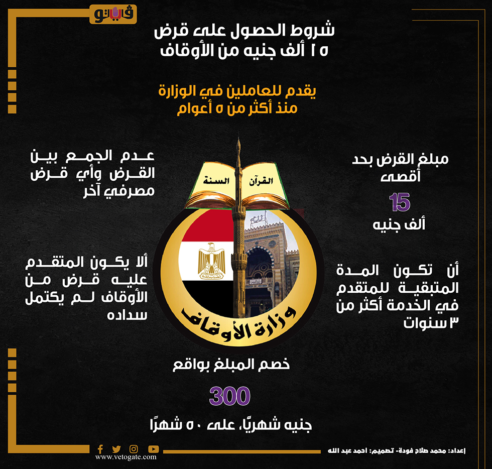 شروط الحصول على قرض 15 ألف جنيه من الأوقاف | إنفوجراف الأربعاء 10/أغسطس/2022 - 11:30 م 8/10/2022 11:30:32 PM الدكتور محمد مختار جمعة وزير الأوقاف محمد صلاح فودة شارك طباعة 18 حجم الخط شارك طباعة قرض وزارة الاوقاف الحسن شروط القرض الحسن شروط القرض الحسن من الأوقاف