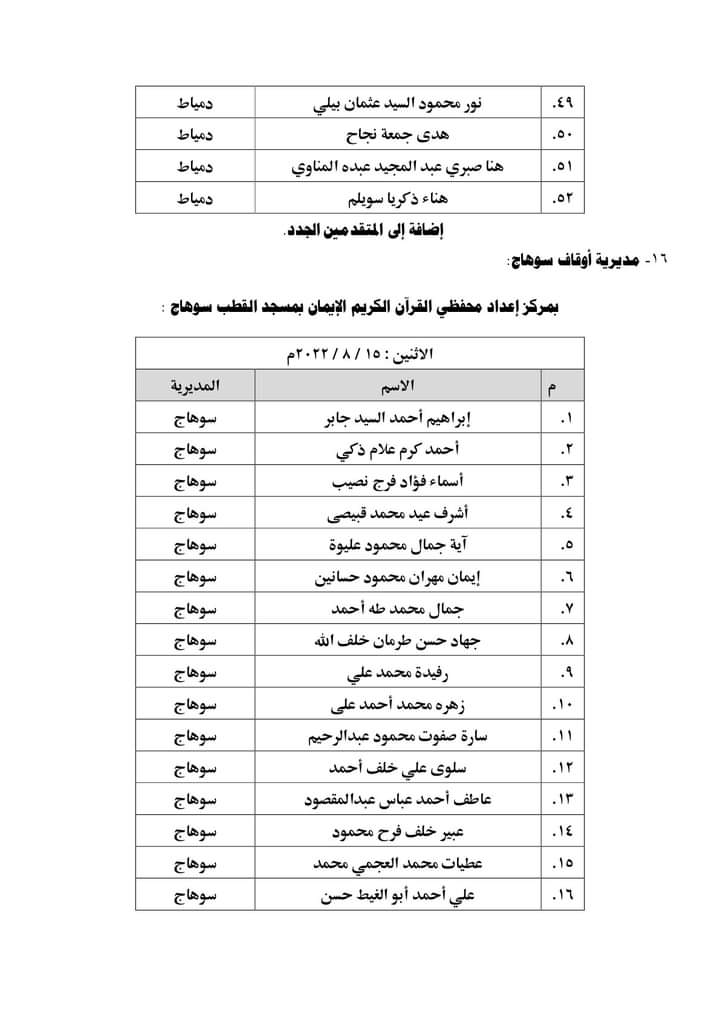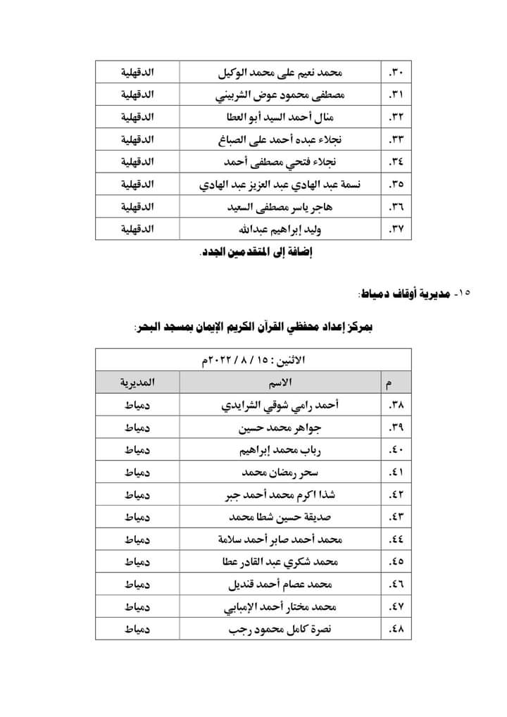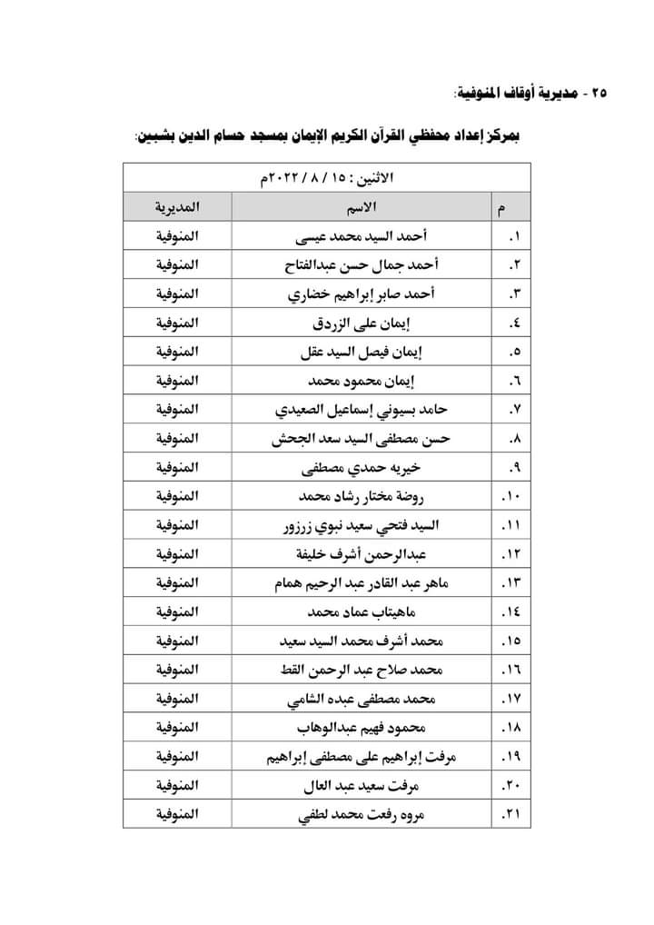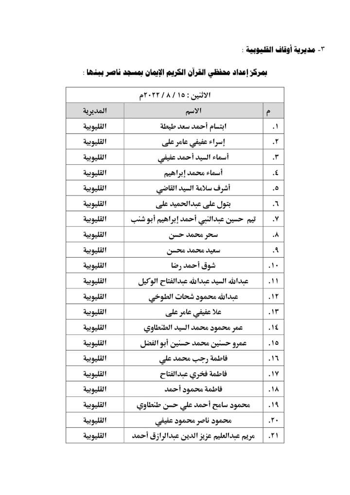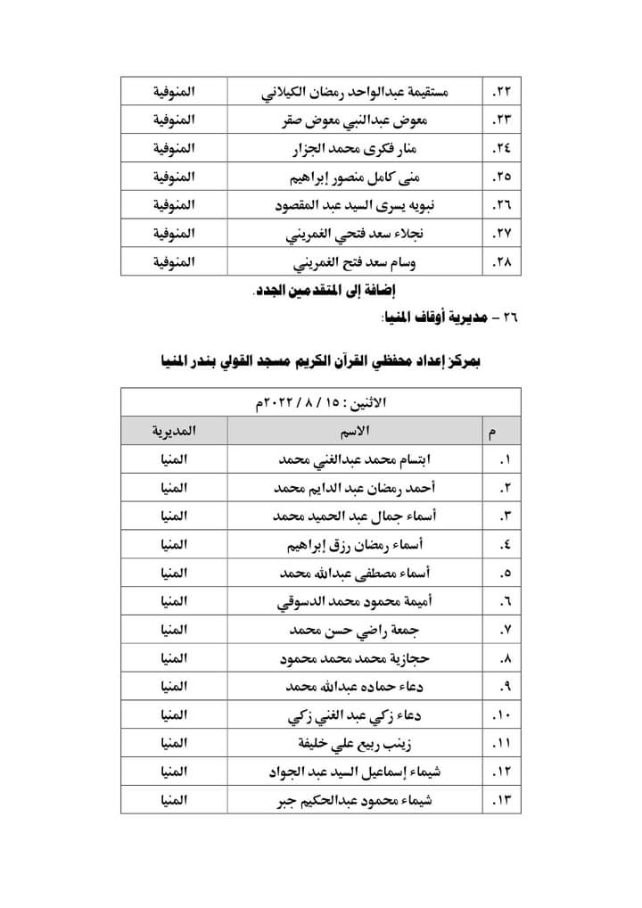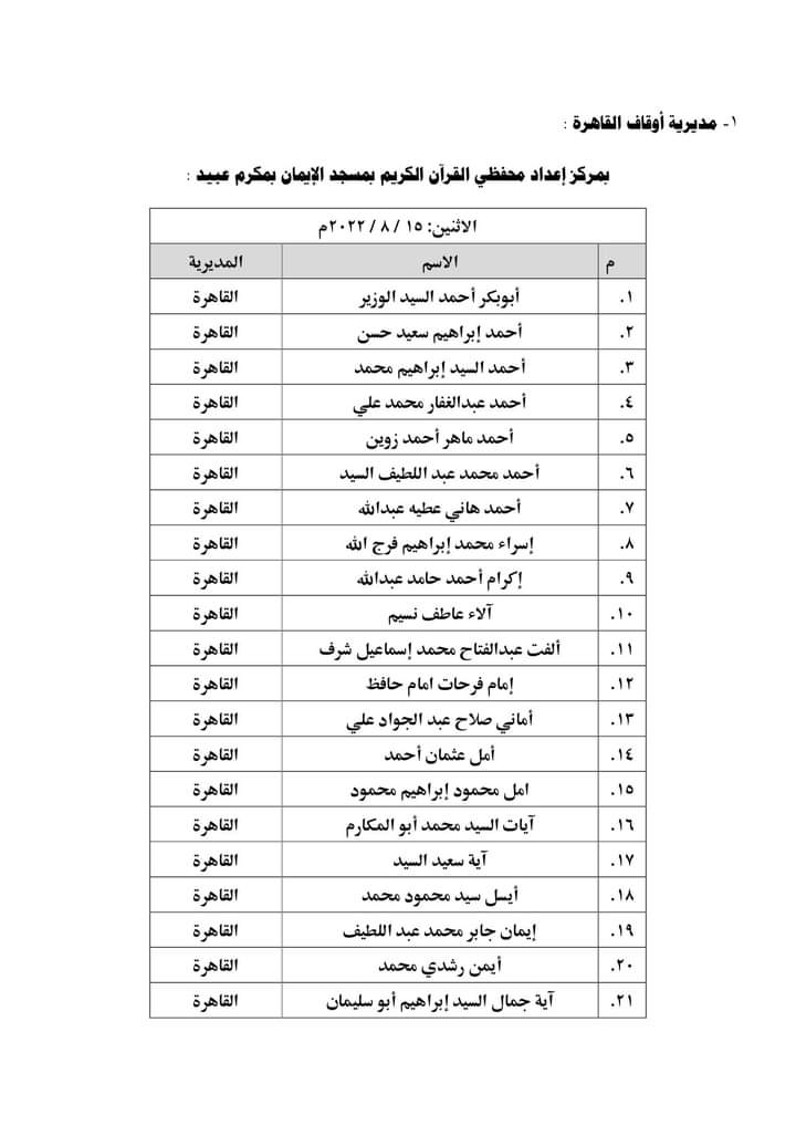 قررت وزارة الأوقاف عقد اختبار القبول لحملة المؤهلات المتوسطة المتقدمين للالتحاق بمراكز إعداد محفظي القرآن الكريم للعام الدراسي 2022 / 2023 م، بجميع المديريات، وستجرى المقابلات للمتقدمين في الأيام والأماكن الموضحة أدناه مع ضرورة إحضار صورة الرقم القومي، وصورتين شخصيتين حديثتين.