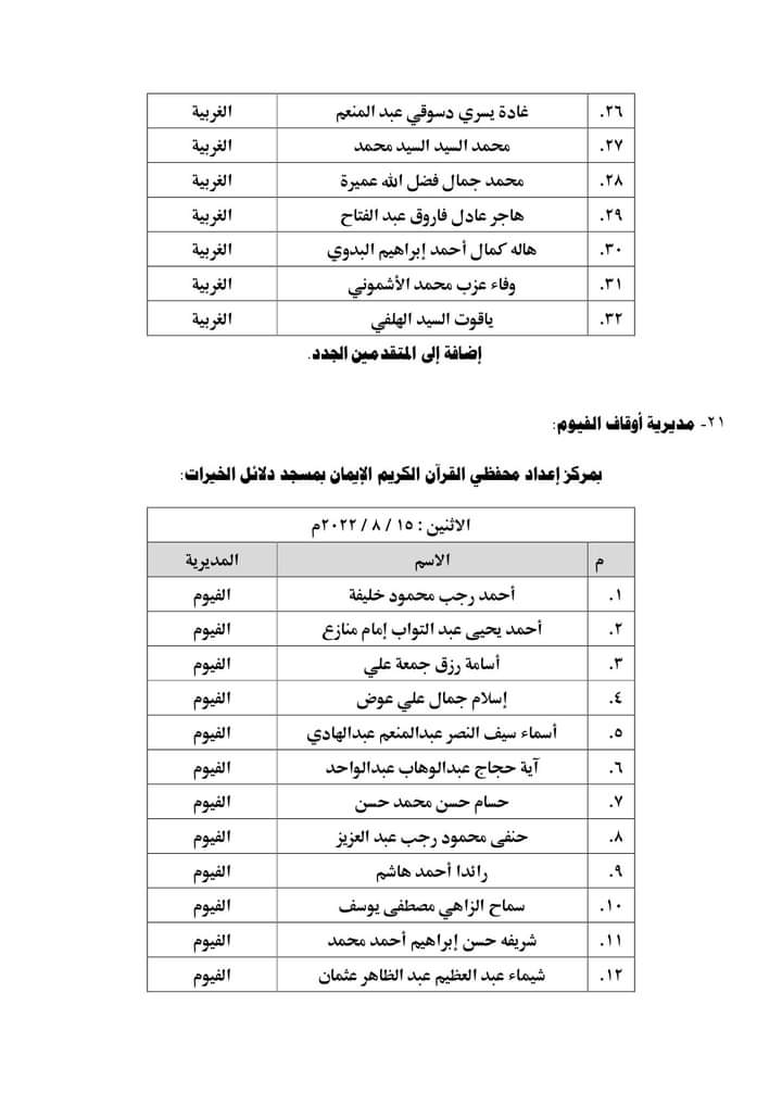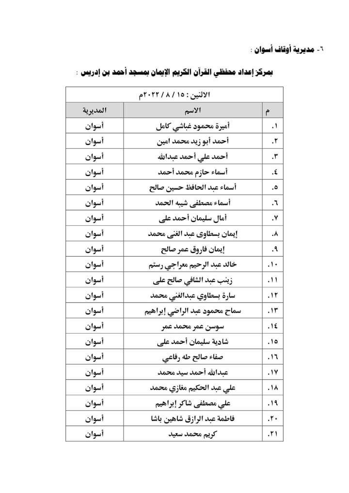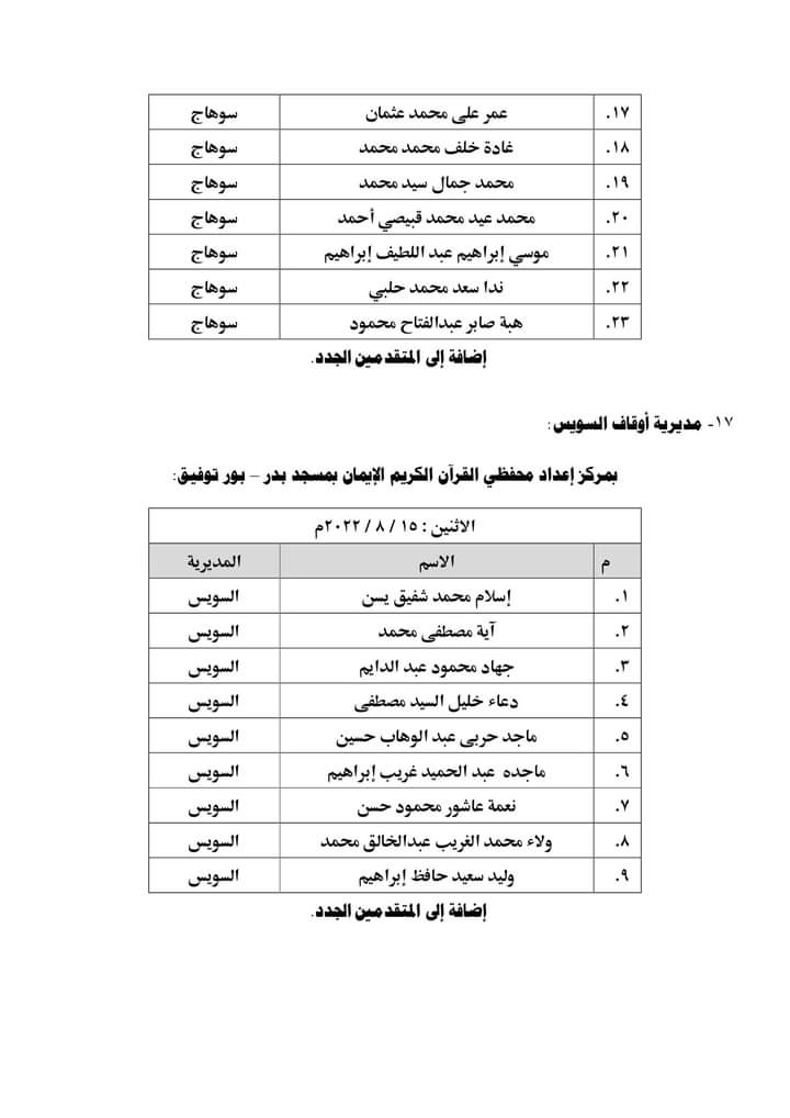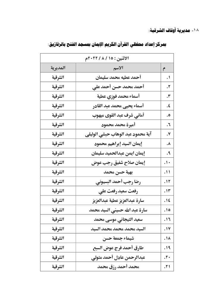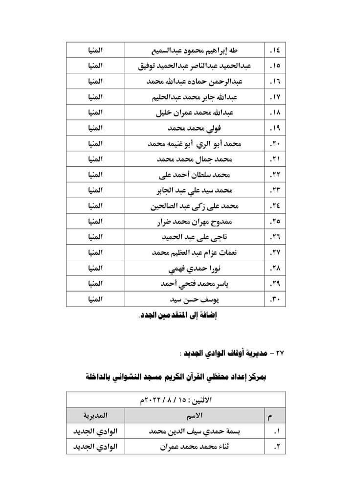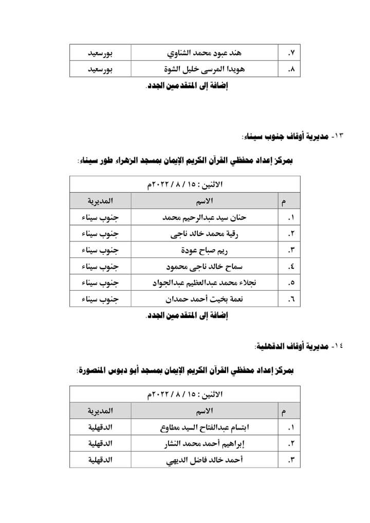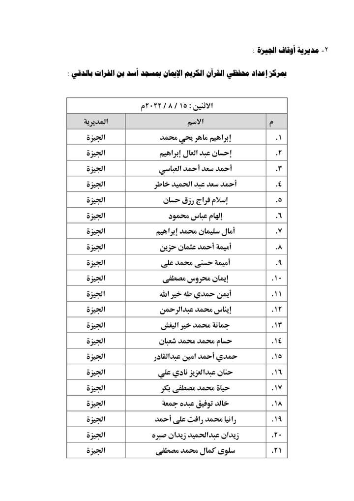 قررت وزارة الأوقاف عقد اختبار القبول لحملة المؤهلات المتوسطة المتقدمين للالتحاق بمراكز إعداد محفظي القرآن الكريم للعام الدراسي 2022 / 2023 م، بجميع المديريات، وستجرى المقابلات للمتقدمين في الأيام والأماكن الموضحة أدناه مع ضرورة إحضار صورة الرقم القومي، وصورتين شخصيتين حديثتين.