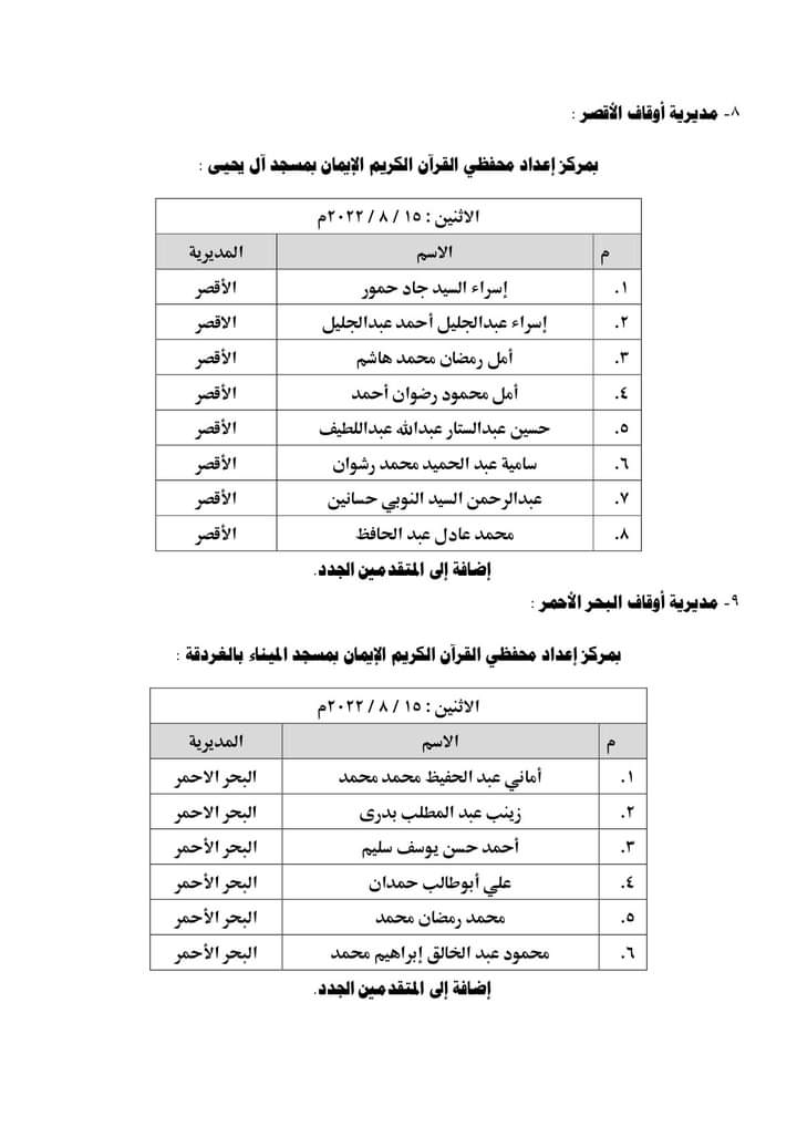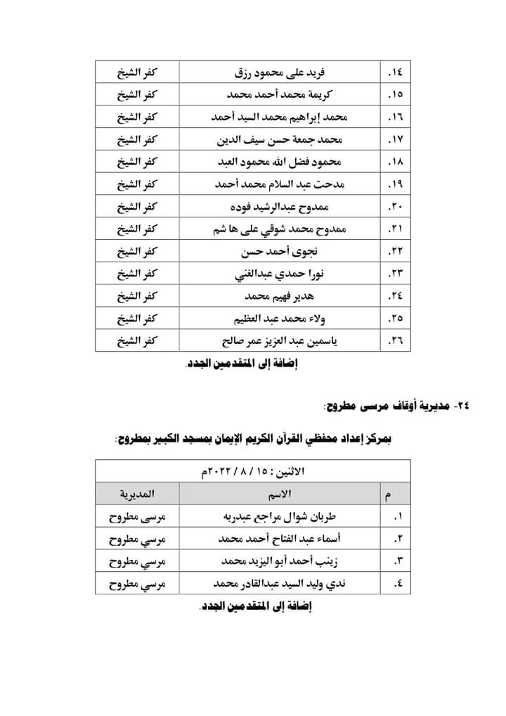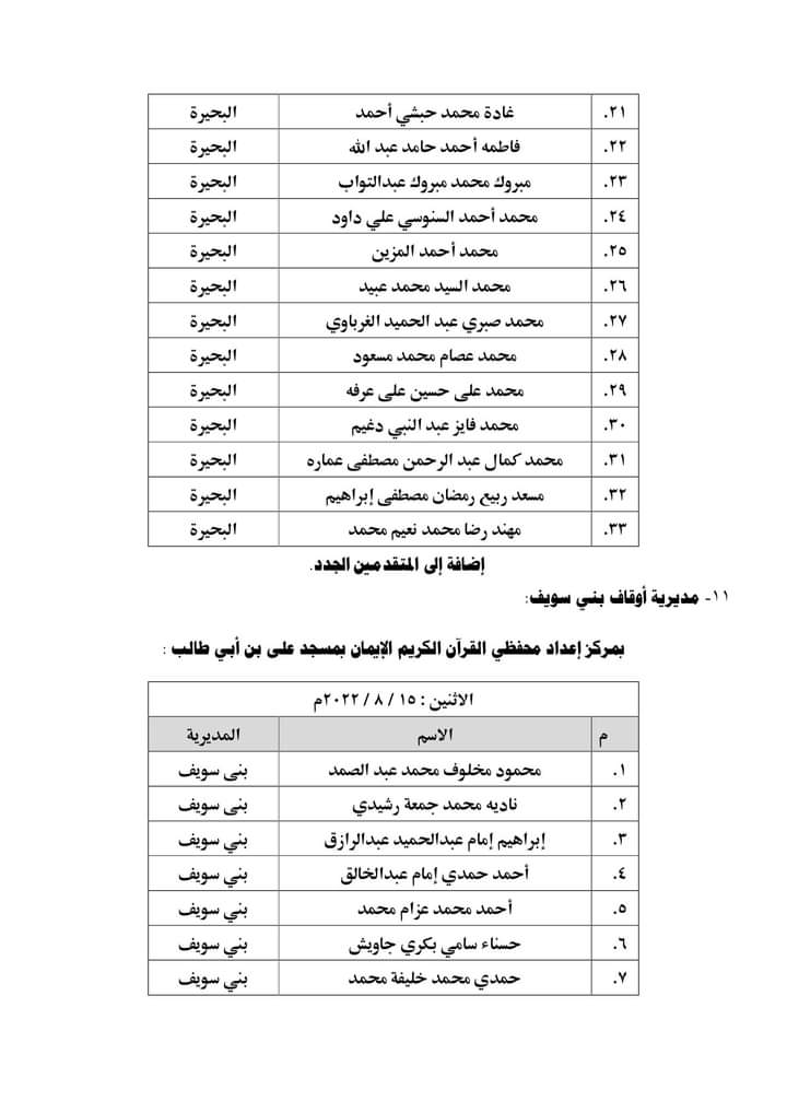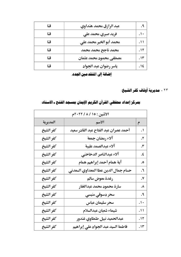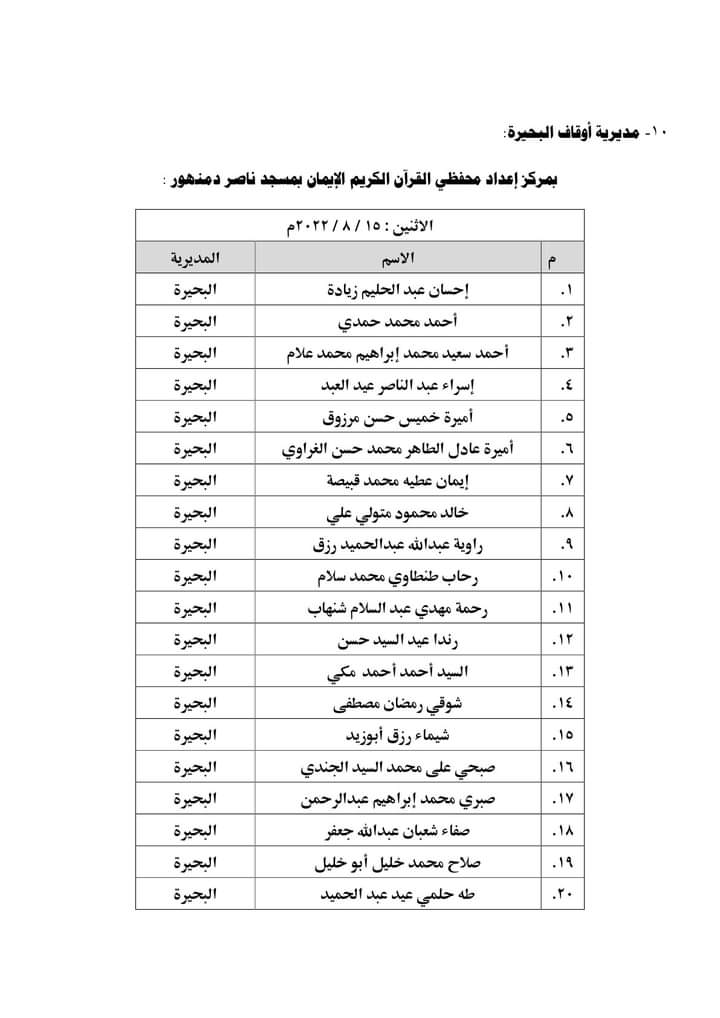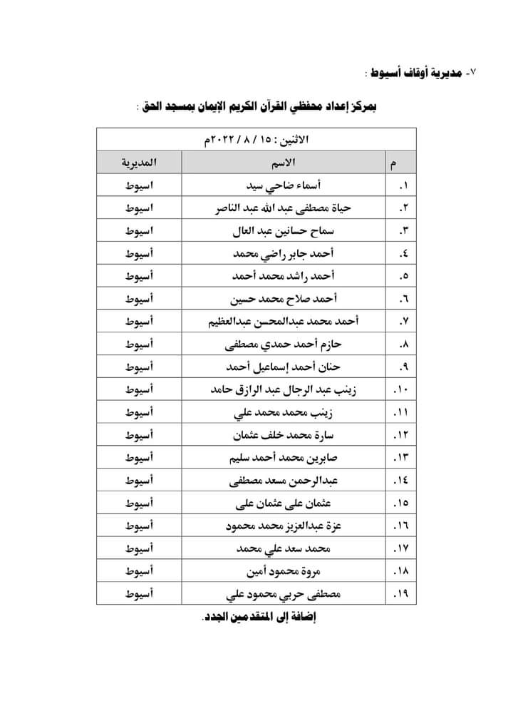 قررت وزارة الأوقاف عقد اختبار القبول لحملة المؤهلات المتوسطة المتقدمين للالتحاق بمراكز إعداد محفظي القرآن الكريم للعام الدراسي 2022 / 2023 م، بجميع المديريات، وستجرى المقابلات للمتقدمين في الأيام والأماكن الموضحة أدناه مع ضرورة إحضار صورة الرقم القومي، وصورتين شخصيتين حديثتين.