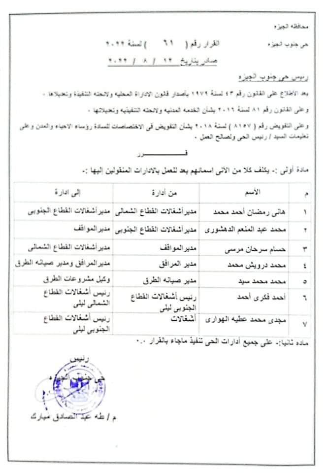 أصدر المهندس طه عبد الصادق رئيس حي جنوب الجيزة، قرارا بتعديل ونقل للموظفين داخل الإدارات التابعة للحي وفقا لكفاءة كل موظف.