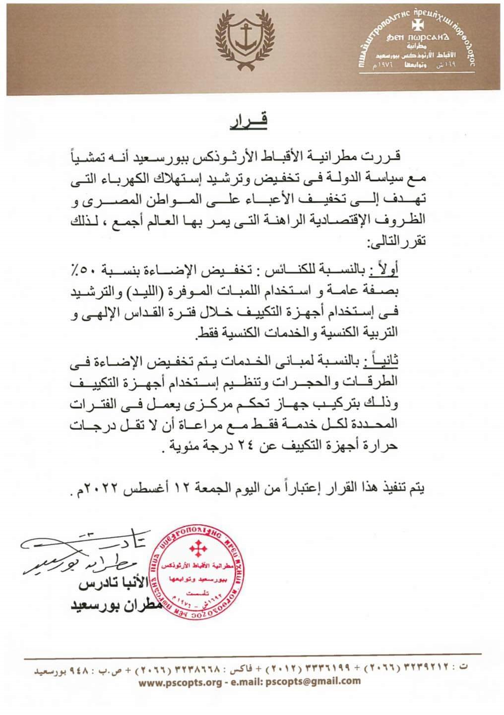 أصدرت مطرانية الأقباط الأرثوذكس في بورسعيد برئاسة الأنبا تادرس مطران محافظة بورسعيد وضواحيها بيانًا أعلنت فيه اتخاذ إجراءات عاجلة لترشيد استهلاك الكهرباء، وذلك تماشيًا مع سياسة الدولة في ذلك الأمر.