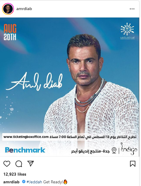 أعلن النجم عمرو دياب عبر حسابه الشخصي على موقع الصور الشهير انستجرام عن إحياءه حفل غنائي ضخم في مدينة جدة بالمملكة العربية السعودية، وذلك مساء يوم السبت المقبل الموافق 30 أغسطس الجاري.