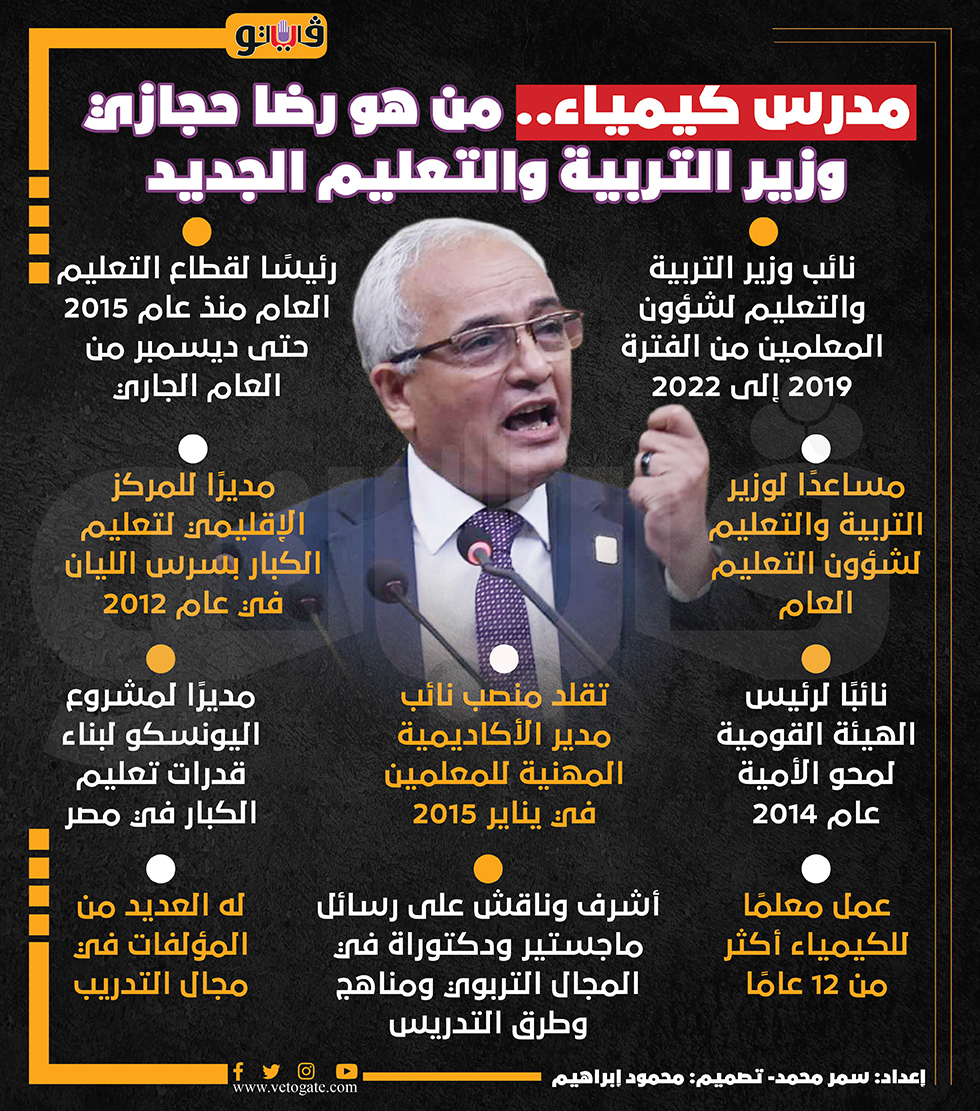مدرس كيمياء.. من هو رضا حجازي وزير التربية والتعليم الجديد | إنفوجراف السبت 13/أغسطس/2022 - 06:20 م 8/13/2022 6:20:52 PM رضا حجازي سمر محمد شارك طباعة 18 حجم الخط شارك طباعة الأكاديمية المهنية للمعلمين التعديل الوزارى التعديل الوزاري الجديد وزير التربية والتعليم الجديد