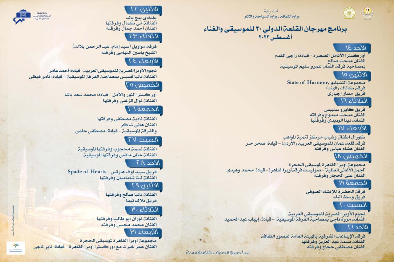 كما يُشارك الموسيقار المصري والعالمي عمر خيـرت، الى جانب حفلين لنجوم الأوبرا للموسيقى العربية بالاضافة إلى عدد من الفرق الدولية منهم بنما وفنزويلا.. ونستعرض الجدول النهائي والرسمي لحفلات النجوم: