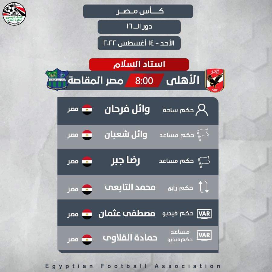 أعلنت لجنة الحكام الرئيسية باتحاد الكرة حكام مباراة الأهلي ومصر المقاصة في دور الـ 16 من بطولة كأس مصر موسم 2021 / 2022.
