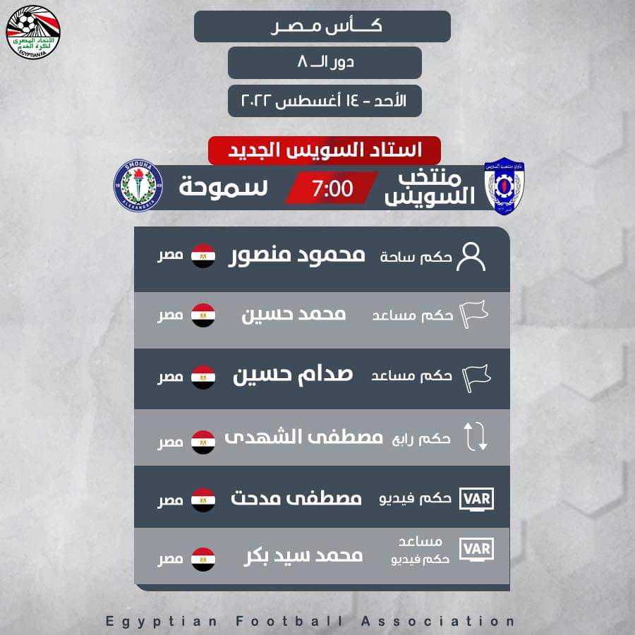 أعلنت لجنة الحكام الرئيسية باتحاد الكرة حكام مباراة سموحة ومنتخب السويس في دور الـ8 من بطولة كأس مصر موسم 2021 / 2022.