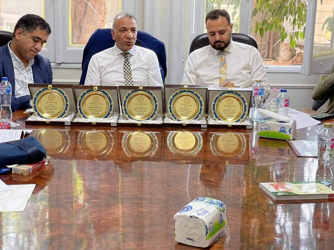 و بدأ التكريم بدعوتهم لحضور الجلسة بعدها قام المجلس برئاسة النقيب العام د ايهاب هيكل بتسليم الدروع للدكتور مجدي بيومي وكيل النقابة السابق.