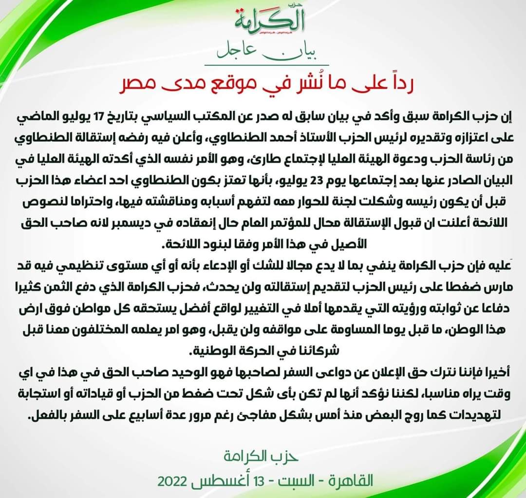 وأصدر حزب الكرامة بيانا ردا علي ما نشر فى بعض المواقع قائلا: إن حزب الكرامة سبق وأكد في بيان سابق له صدر عن المكتب السياسي بتاريخ ١٧ يوليو الماضي على اعتزازه وتقديره لرئيس الحزب أحمد الطنطاوي وأعلن رفضه إستقالة الطنطاوي من رئاسة الحزب ودعوة الهيئة العليا لإجتماع طارئ، وهو الأمر نفسه الذي أكدته الهيئة العليا في البيان الصادر عنها بعد إجتماعها يوم ٢٣ يوليو، بأنها تعتز بكون الطنطاوي احد اعضاء هذا الحزب قبل أن يكون رئيسه وشكلت لجنة للحوار معه لتفهم أسبابه ومناقشته فيها، واحتراما لنصوص اللائحة أعلنت ان قبول الإستقالة محال للمؤتمر العام حال إنعقاده في ديسمبر لانه صاحب الحق الأصيل في هذا الأمر وفقا لبنود اللائحة.