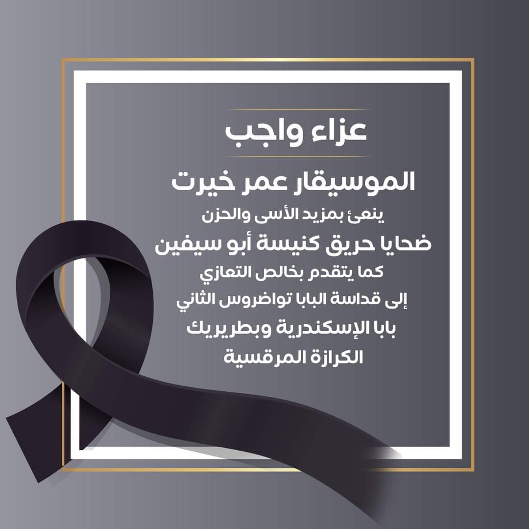 وكتب «عمر خيرت» عبر حسابه الشخصي بموقع التواصل الإجتماعي «فيس بوك»: عزاء واجب.. الموسيقار عمر خيرت ينعى بمزيد الأسى والحزن ضحايا حريق كنيسة أبو سيفين.. كما يتقدم بخالص التعازي إلى قداسة البابا تواضروس الثاني بابا الإسكندرية وبطريريك الكرازة المرقسية.