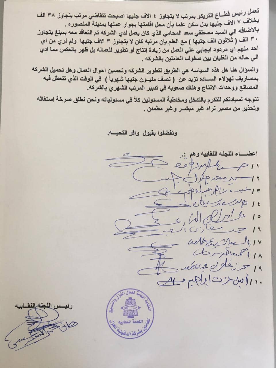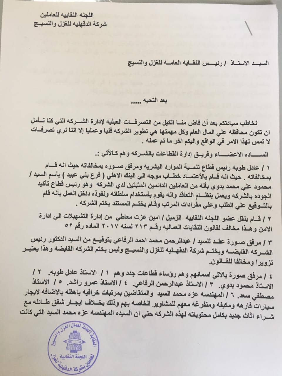 نقابة النسيج: التحقيق ومتابعة شكوى مخالفات وتزوير باللجنة النقابية بشركة الدقهلية
