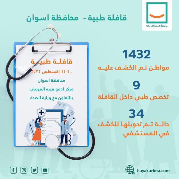 - نظمت مؤسسة حياة كريمة في محافظة أسوان - مركز ادفو قرية المريناب، وبالتعاون مع وزارة الصحة قافلة طبية شملت 9 تخصصات مختلفة: الباطنة، أسنان، أطفال، عظام، نساء وتوليد، أنف وأذن، جراحة عامة وجلدية ومسالك وتم الكشف والفحوصات وصرف العلاج كان بالمجان لكل المشاركين في القافلة.