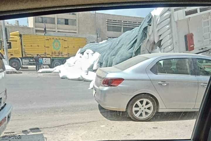انقلاب حمولة مقطورة نقل محملة بالدقيق بطريق طنطا -إسكندرية الزراعي |صور