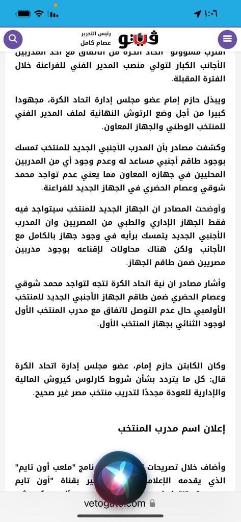 عصر يوم الأحد 26 يونيو الماضي تلقيت اتصالا هاتفيا من الصديق عصام الحضري وجدته غاضبا من خبر منشور في موقعنا مفاده أن المدرب الأجنبي القادم سيأتي بجهاز فني كامل بما فيه مدرب حراس مرمى وأن الكابتن الحضري سيتم الاستعانة به في المنتخب الأولمبي.. هكذا كتبنا يوم 26 يونيو.