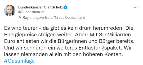 وكتب أولاف شولتس تغريدة عبر حسابة الرسمي بتويتر "إنها تزداد تكلفة - ليس هناك من تجنبها. أسعار الطاقة تستمر في الارتفاع. لكن: مع 30 مليار يورو نحن بالفعل نخفف العبء عن كاهل المواطنين. ونقوم بتجميع حزمة إغاثة أخرى. نحن لا نترك أي شخص بمفرده مع ارتفاع التكاليف"